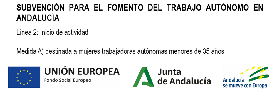 Bastidas Mosquera Diana, ha recibido una subvención de la Consejería de Empleo, Empresa y Trabajo Autónomo de la Junta de Andalucía, financiada por la Unión Europea con cargo al Programa FSE+ Andalucía 2021-2027, para el fomento del trabajo autónomo en Andalucía. Línea 2 de subvención para inicio de actividad económica o profesional, destinada a mujeres trabajadoras autónomas menores de 35 años